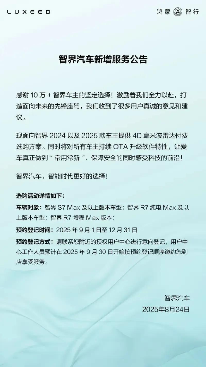 8月24日,我们从官方渠道获悉,、智界汽车正式推出针对老车主的4D毫米波雷达付费选装服务,开放对象为2024及2025款符合条件的车型用户。官方表示,此次升级旨在提升车辆智能驾驶能力,配合持续OTA软件更新,实现“常用常新”的用车体验。