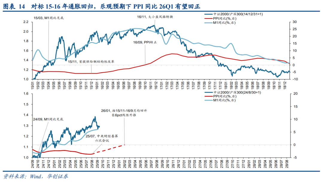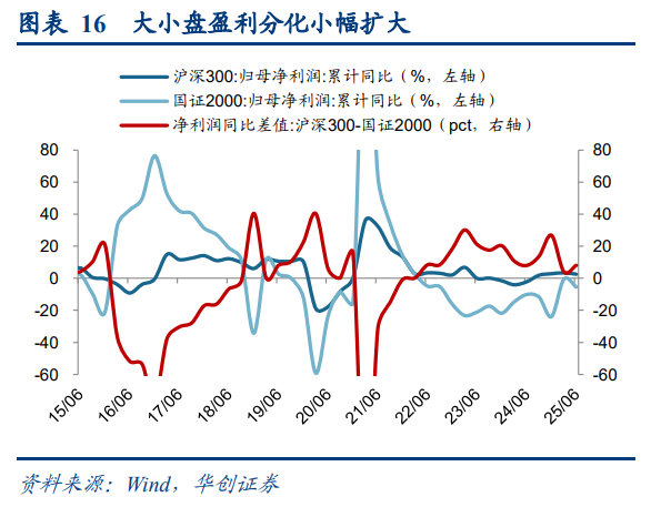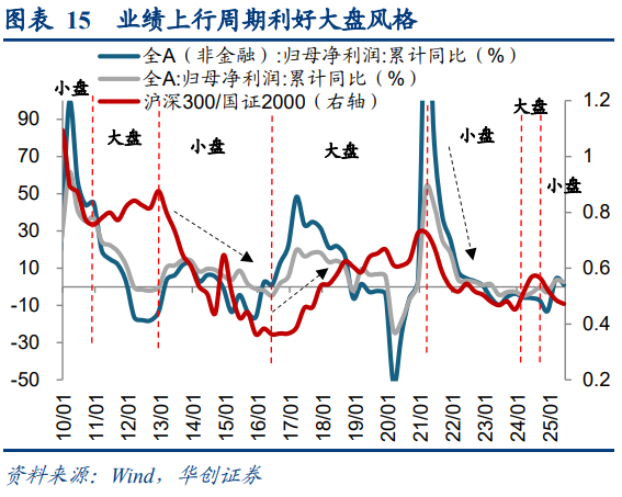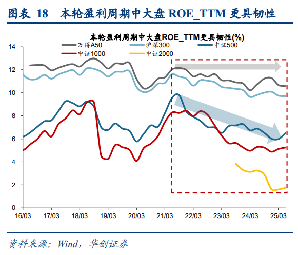 1)大盘>小盘主要基于三点:①通胀之下大盘业绩更优:当前沪深300-国证2000盈利增速差由4 pct扩大至8 pct,如我们秋季策略《再通胀牛市的中场切换》所述,通胀回升环境大盘业绩往往跑赢,当前若按照15/11-16/9月均回升0.6pct线性外推,则26/1PPI有望回升至0;②过去五年大盘ROE韧性更强:本轮盈利周期中,大盘ROE韧性更强,A50 21Q3 ROE高点12.2%,25Q2 10.6%,沪深300 11.4%→9.7%、中证500 9.8%→6.5%、中证1000 8.3%→5.2%,小盘盈利能力下滑显著;③ETF扩容对大市值风格加强:市值越大越可能被纳入指数而被 ETF 跟踪,通过市值加权匹配机制,市值越大在ETF中权重越高,ETF占比提升,自我强化式循环将不断推高大市值公司估值。