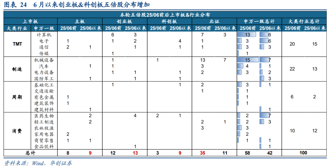 2)短期重视科创:科创行情内部已实现大小盘风格逆转,6月以来科创板&创业板的五倍股分布显著增加;