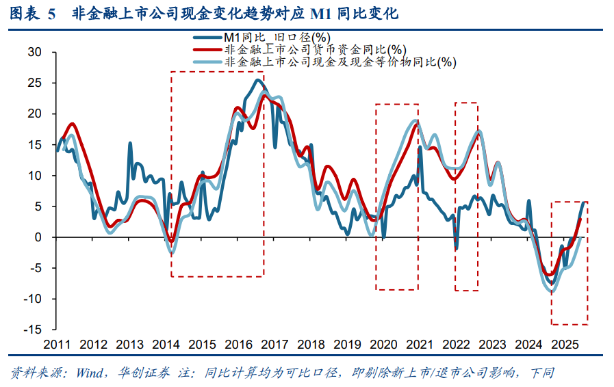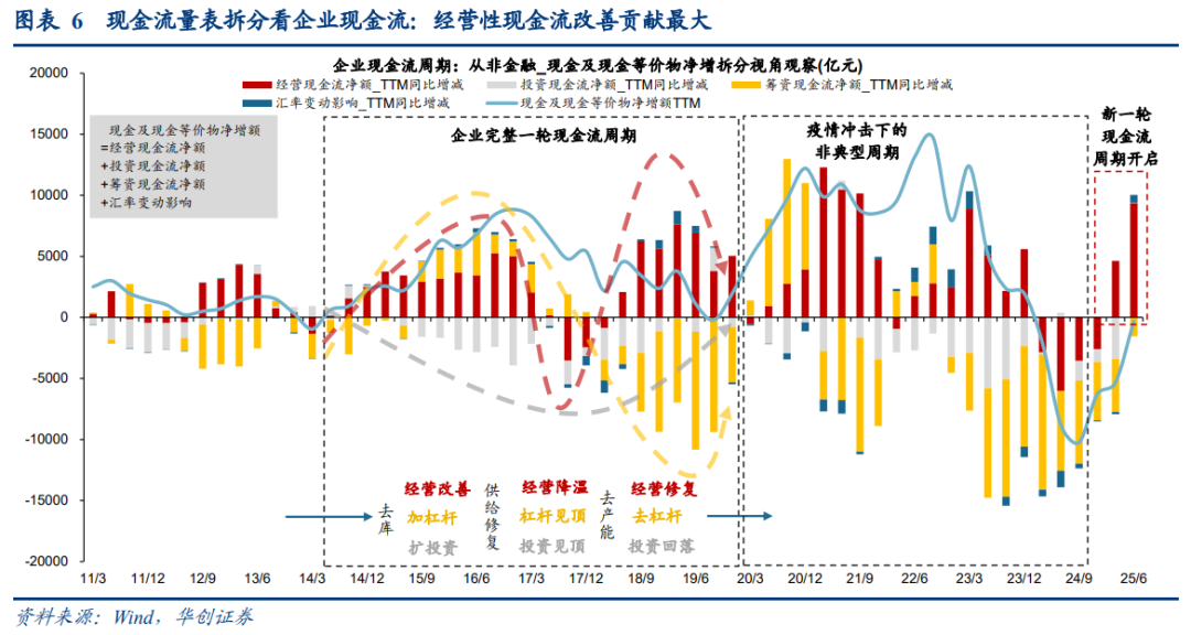 2)M1活化+企业经营性现金流改善带来价格转正的流动性可能。旧口径M1同比回升,具体表现为24/9-25/8上升13pct;①对应至企业层面,我们统计非金融上市公司货币资金、现金及现金等价物的同比变化,可以看出企业现金变化趋势基本能对应M1同比变化,企业货币资金、现金同比24/9-25/6均已回升9pct;②通过现金流量表拆分观察企业经营&投资&筹资行为,观察到经营现金流对企业类现金资产增额改善的贡献最为显著。以上表明企业经营性现金流好转、资金流转加速,支出与收入循环增强,从而推动价格预期上行;