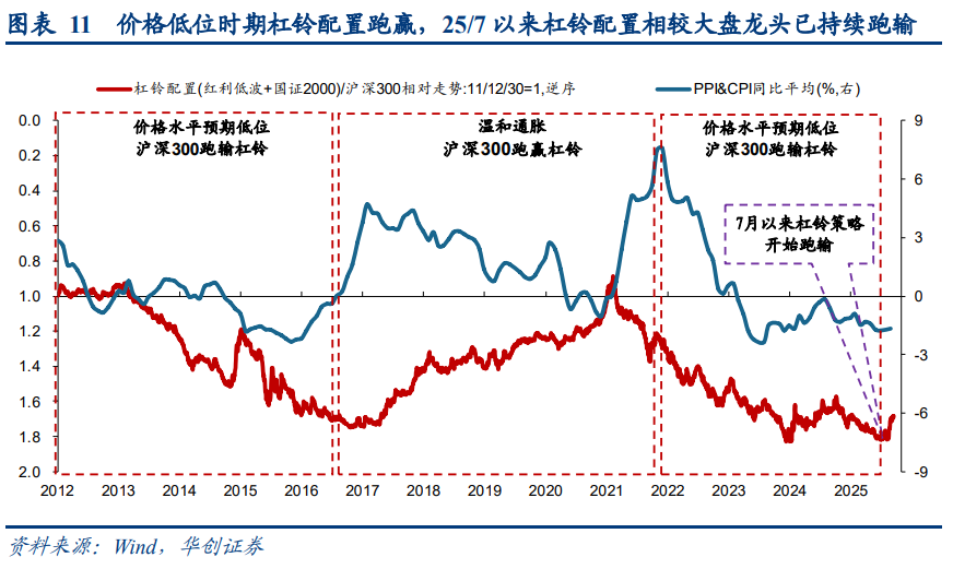 杠铃配置适配价格低位环境,通胀预期回升后反杠铃配置需求提升。如我们在9/14《反杠铃配置——策略周聚焦》中所述,从本质上看,杠铃策略更适合价格低位环境。具体的杠铃策略上我们以国证2000代表小微盘、以红利低波代表高股息现金策略,测算发现如13年-16H1、22年-25H1价格预期低位区间中,杠铃策略跑赢沪深300;而17-22年的温和通胀区间,沪深300跑赢杠铃。主要原因在于:一是红利低波受益于价格低位背景下的类现金资产占优;二是货币政策宽松与实体信贷需求恢复的时滞之下,小微盘风格享受剩余流动性充裕环境。而7月以来市场从3500点持续上行至近3900点,杠铃配置(红利低波+国证2000)累计收益率6%,而沪深300为+14%、科创50为+36%、创业板指+44%,反内卷带来通胀预期的回升下,大盘成长风格显著更强,杠铃策略开始跑输。