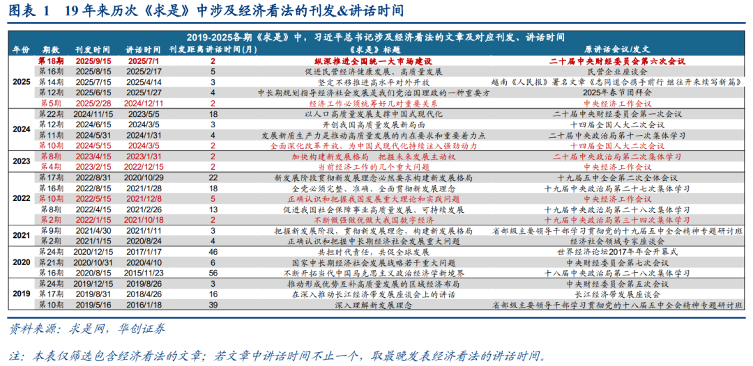 1、7/1财经委讲话的即时刊发印证了中央对反内卷工作的急迫性,从政治和全局高度出发予以高度重视,统一思想。本期《求是》内容强调“当前最急迫的是聚焦重点难点,下决心清除顽瘴痼疾”,其中首要即是“着力整治企业低价无序竞争乱象”;强调“建设全国统一大市场,既是攻坚战,也是持久战,各地区各部门要从政治和全局高度抓好落实”,体现反内卷在政治和全局层面被赋予极高立意。本次刊发的即时性上,我们统计19年来各期《求是》中习总书记发表文章中涉及经济看法的共24篇,其中仅有6篇的刊发时间距讲话时间为两个月,此外多数讲话均为刊发时间时隔半年甚至一年以上。而此前较即时刊发的讲话,一般对应的是上年末经济工作会议的重要讲话内容,刊发时间为次年的两会前后,旨在两会中对全年的经济工作任务做详细布置,形成共识、凝聚统一思想,以更好地处理经济工作,例如:25/2第5期刊发习总书记24/12在中央经济工作会议上的讲话,针对地产&消费低迷、PPI持续负增的背景,强调大力提振消费、提高投资效益,全方位扩大国内需求;23/2第4期刊发习总书记22/12在中央经济工作会议上的讲话,面临需求端三驾马车走弱、地产承压态势,确立扩内需、强产业、两个毫不动摇、稳外资、防风险为来年的经济工作重心。而关注到本次7/1财经委讲话刊发的即时性,我们认为其与中央经济工作会议的刊文具备同等效力及急迫性。同时我们也可以从各部委及行业协会对反内卷的表态中印证这一点:9月以来,工信部、市场监管总局、信息化部、国家能源局、发改委、商务部等部门及养猪、玻璃纤维、汽车等行业协会均先后发表讲话或发文,加速介入反内卷的推进落地。