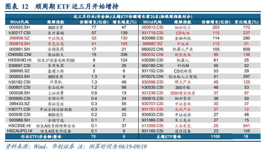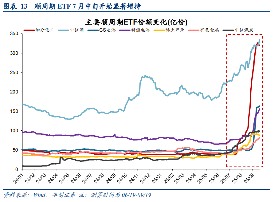 反杠铃配置不仅已在股价上出现拐点,量的角度看顺周期ETF近三月显著增持。我们观察到过去三个月ETF明显增持的类别中既有市场共识的双创板块弹性品种诸如:机器人、创新药、金融科技等,顺周期板块同样出现明显的增持态势,这是印证市场认同反内卷预期带来通胀恢复的积极信号。行业ETF中顺周期显著增持的为中证煤炭、有色金属;主题ETF中顺周期前五为:细分化工、CS电池、中证酒、新能电池、稀土产业。具体来看其中增持较多的板块包括:①化工:细分化工近三月份额增长283亿,规模放大770%。反内卷落地驱动PPI修复,化工在PPI构成中的权重较高,固定资产投资完成额5月已转负;②白酒:中证酒近三月份额增长113亿,规模放大51%。白酒基本面风险充分释放叠加行业的高股息优势;③电池:CS电池近三月份额增长115亿,规模放大237%;新能电池近三月份额增长89亿,规模放大136%。新能源车产业链反内卷,锂电材料价格上行,储能需求拉动;④有色:稀土产业近三月份额增长49亿,规模放大125%;有色金属近三月份额增长41亿,规模放大105%;SSH黄金近三月份额增长37亿,规模放大97%;工业有色近三月份额增长25亿,规模放大541%。铜、铝等工业金属及稀土等小金属供给偏紧,受益于反内卷政策及降息周期;⑤煤炭:中证煤炭近三月份额增长55亿,规模放大130%;煤炭产能核查,价格回升,低估值、高股息特征吸引长期资金配置。