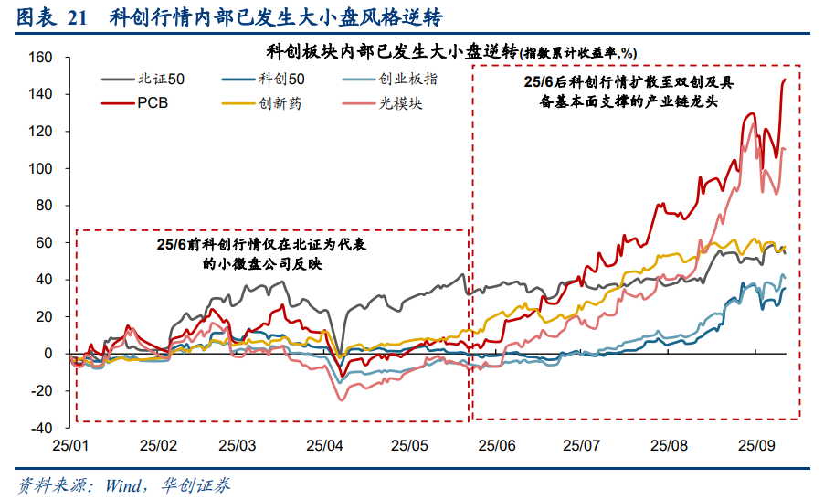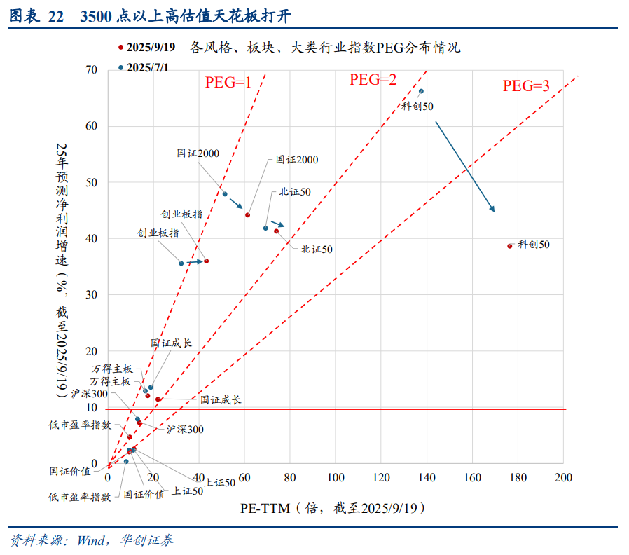 2、短期内高度重视科创。我们在8/31《未到高低切时刻,保持积极——策略周聚焦》、9/7《自胜者强——策略周聚焦》、9/14《反杠铃配置——策略周聚焦》中持续强调在热门板块(PCB、创新药等)方面,近期均未出现明显的成交过热迹象,目前我们继续维持对科创的乐观判断。具体年内科创行情来看,在25/6以前更多反映在北证为代表的小微盘公司中、并未有明确产业主线,而在25/6以来科创内部已发生大小盘的风格逆转,并且伴随着更多具备基本面催化的产业链龙头领涨(如PCB、光模块、创新药),主要驱动在于市场涨至3500点以上估值天花板已打开,PEG行情向2倍扩散。另外,我们在8/27《本轮牛市百只五倍股画像》中对本轮牛市已诞生的百只五倍股进行整理,发现每轮牛市的十倍股行业分布对应的主线产业切换明显,领涨个股分布代表本轮经济增长或转型的主驱动:例如本轮AI&国产替代引领科创牛市;19-21年半导体+新能源成为主线;16-18年消费升级&供给侧改革推动消费&资源品走强。且我们观察到25/6以来科创板&创业板的五倍股分布显著增加:25/6前的五倍股分布以AI产业链&机器人为首的高端制造为主,集中于北证;25/6后AI&PCB产业链&创新药使得计算机、电子、机械、医药板块涌现领涨个股。上市板分布上不同于6月前集中于北证,创业板、科创板占比均显著提升。