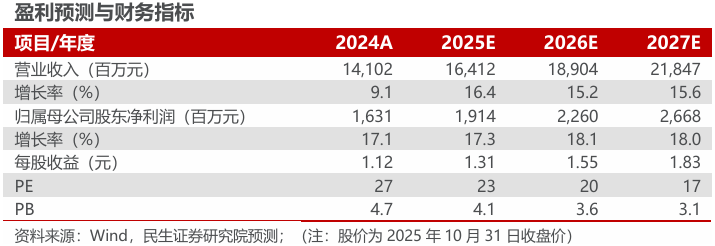 2025年10月31日,公司发布2025年三季报,2025年前三季度公司实现收入129.14亿元,同比增加18.82%;归母净利润14.70亿元,同比增加15.78%;扣非归母净利润14.10亿元,同比增加17.57%。单Q3情况来看,公司25Q3实现收入45.67亿元,同比增加25.54%;归母净利润5.06亿元,同比增加18.95%;扣非归母净利润4.84亿元,同比增加17.02%。盈利能力方面,公司25Q3实现毛利率35.35%,同比减少0.59pct,环比增加0.69pct;实现净利率14.63%,同比减少1.03pcts;环比减少2.20ptcs。创新研发持续投入,2025年前三季度研发投入6.27亿元,同比增长17.2%,研发投入总额占营业收入比例4.85%。