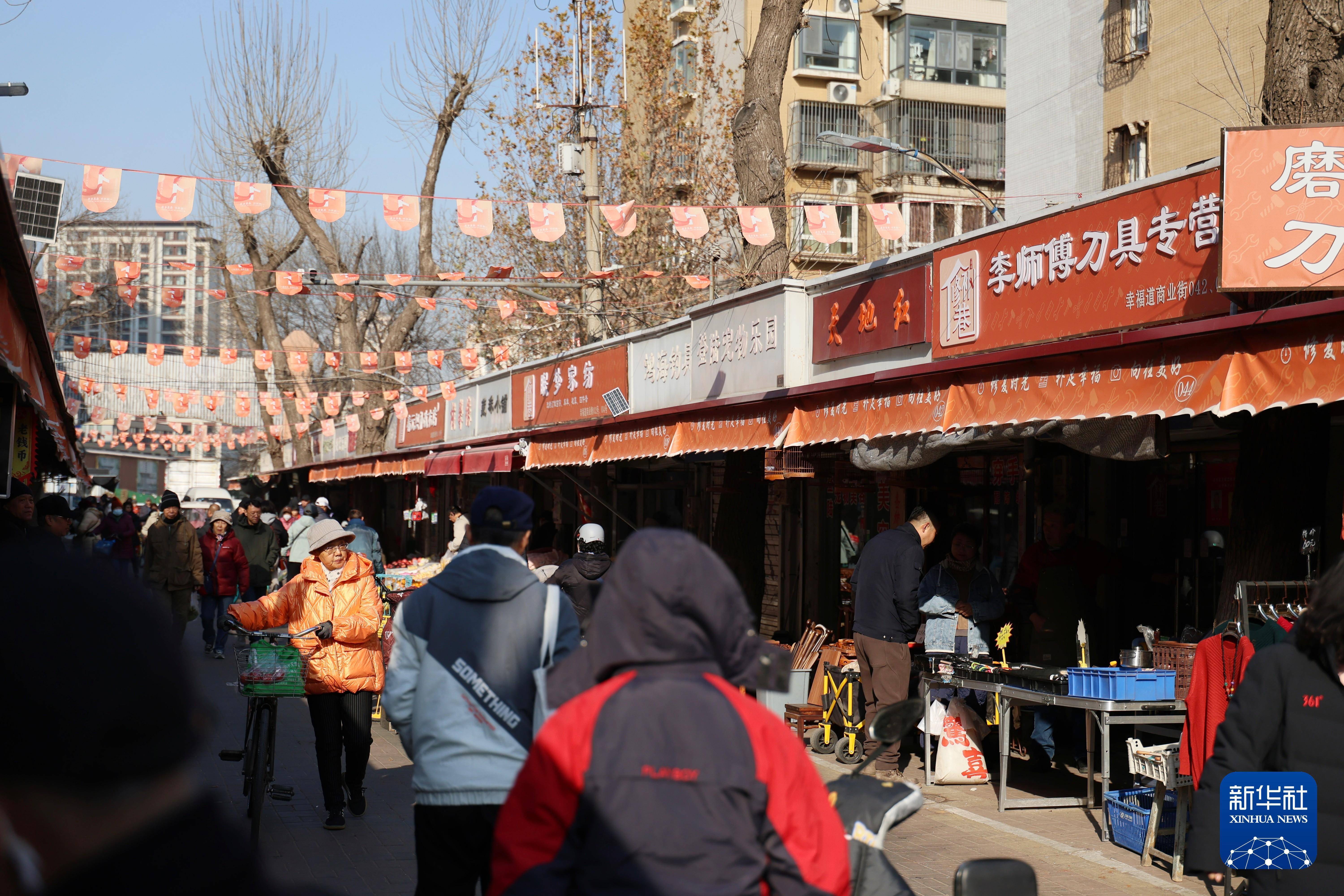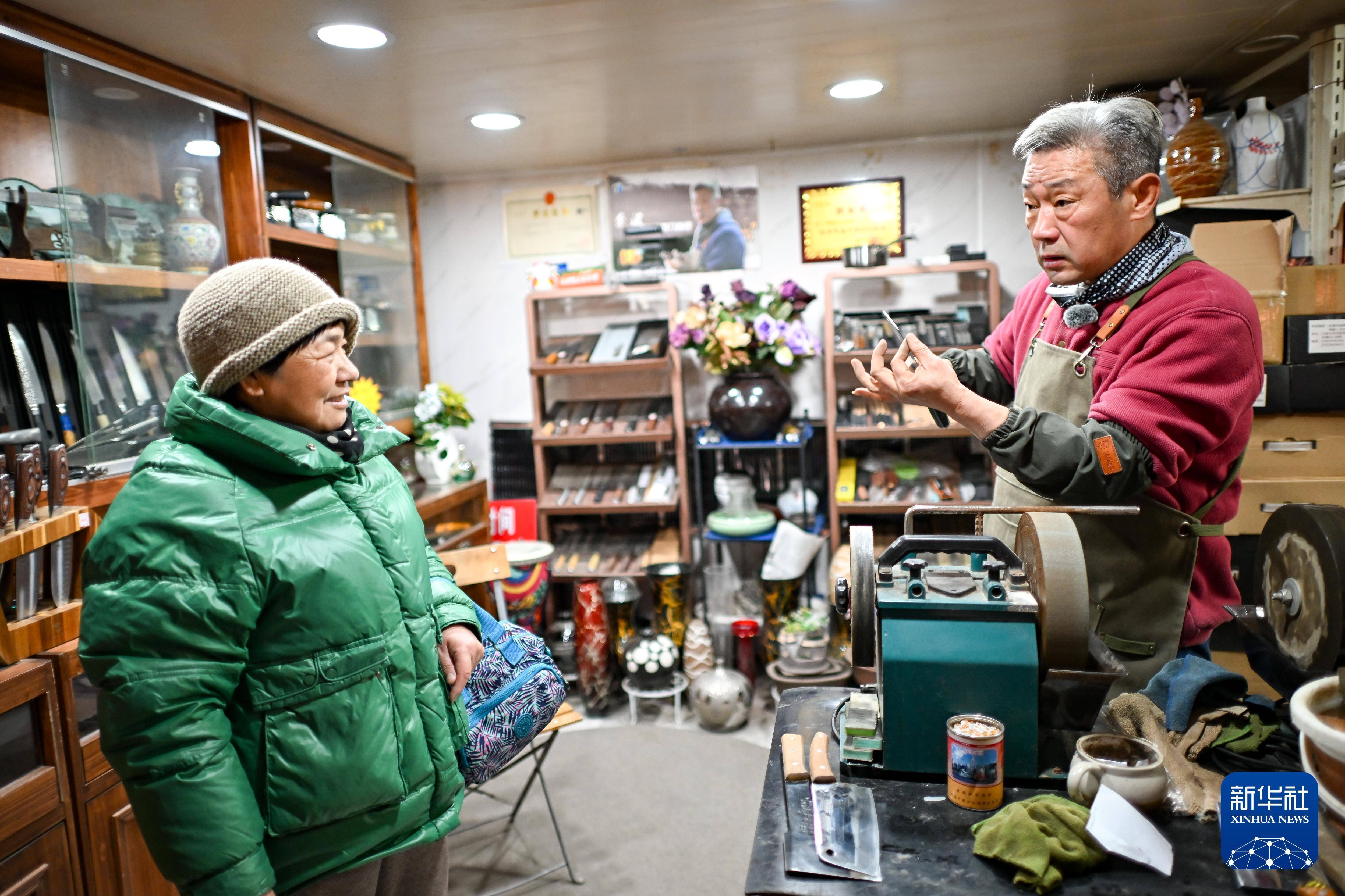 2025年12月9日,磨刀师傅李波(右)在为顾客介绍刀具。“修补巷”位于幸福道商业街内