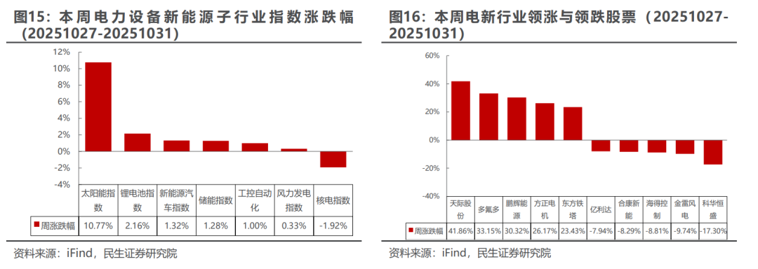 板块子行业:本周太阳能指数涨幅最大,核电指数跌幅最大。太阳能指数上涨10.77%,锂电池指数上涨2.16%,新能源汽车指数上涨1.32%,储能指数上涨1.28%,工控自动化上涨1.00%,风力发电指数上涨0.33%,核电指数下跌1.92%。