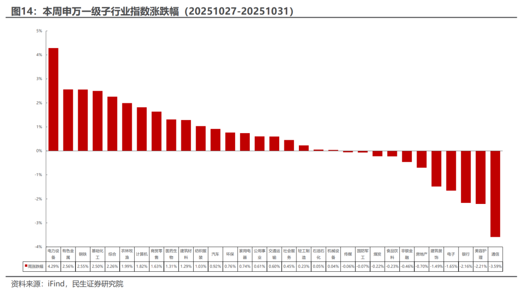 电力设备与新能源板块:本周上涨4.29%,涨跌幅排名第1,强于上证指数。本周太阳能指数涨幅最大,核电指数跌幅最大。太阳能指数上涨10.77%,锂电池指数上涨2.16%,新能源汽车指数上涨1.32%,储能指数上涨1.28%,工控自动化上涨1.00%,风力发电指数上涨0.33%,核电指数下跌1.92%。