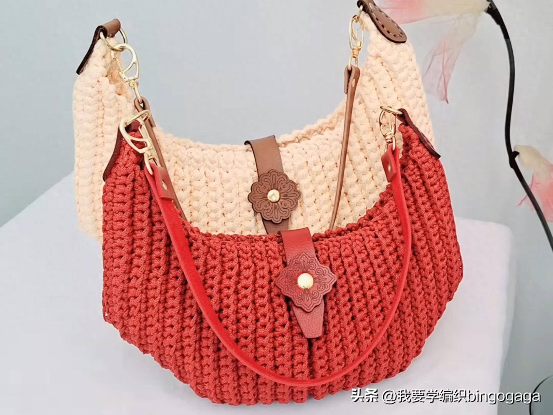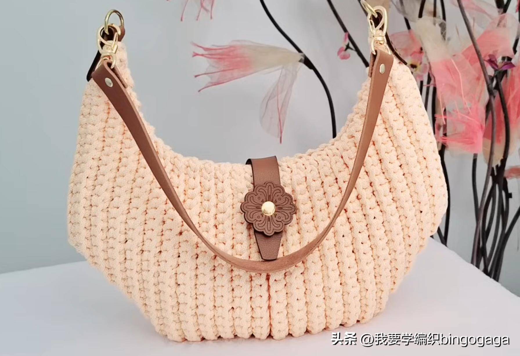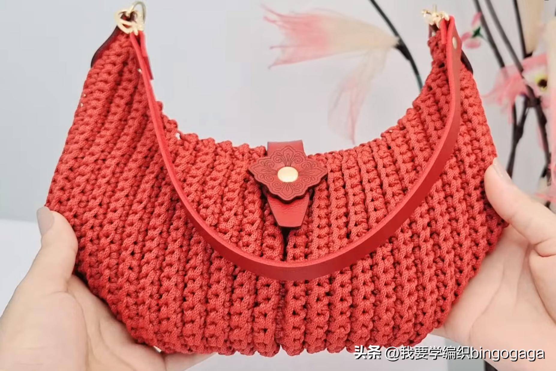 最近兴起各种罗纹图案的包包,因为这样的纹路大方又有型,钩出来的作品也很养眼。今天我们学习的是一款罗纹饺子包的钩法,示范款为米黄色的这款,用的是5mm的涤纶纱,5mm的钩针,示范款包包的尺寸约为29cm宽*18cm高;图中的红色款用的是3mm的丙纶纱线,尺寸约为27cm宽*15cm高。